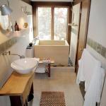 The room’s cozy proportions and strong outdoor ties also originate in the Far East. Floor-to-ceiling glass adjacent to the soaking tub brings nature in while visually expanding the space. Natural materials and forms inside the room strengthen an indoor-outdoor relationship. De Vido purchased a 14-foot section from a locally felled tree to make custom furniture for the house, and several of those pieces are in the bathroom; the planks became a vanity, storage bench, and wall shelf. Irregular edges were left intact, but fine sanding and a high polish give the pieces a finished look.