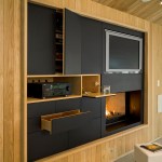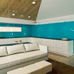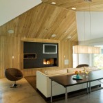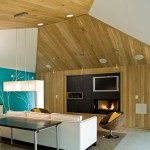 The main interior space was opened vertically by removing the existing ceiling joists and wrapping a slatted white oak wall surface up and across the vaulted ceiling. A slate-clad entertainment center was built into the wood wall, incorporating a flat screen TV, gas fireplace, stereo components, and game storage.