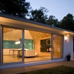 This renovation project transformed an existing two-car garage into a pool/guest house. In order to engage and enliven the adjacent pool area, a 16’ wide sliding glass door system was inserted into the side of the building.