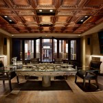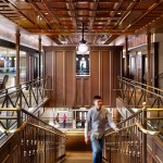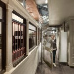 While the interior space feels modern-traditional, history is in the details: classical trim, pressed-tin ceilings, full-height columns, the original chandeliers, the teller windows, old cabinets, and the commercial transaction counter. Even the new elements and materials—most of the building—are faced or treated to look old and create a perfect illusion of originating in the building’s original era.