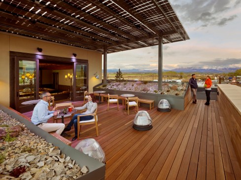 The heart of daily operations beats upstairs. Here, we designed a combination of private offices and open workspaces, as well as casual meeting areas. Tall cabinets and map drawers from the original bank reside upstairs, and open staircases feel modern but give a nod to history with the handrails and end returns. On the roof, a small, cramped room that was originally a lookout was converted into a larger, open penthouse with comfortable furniture, drop-dead views of the Sierras, and an outdoor terrace comfortably enclosed by sloping, bowl-shaped planting areas. This patio has quickly become a favorite space for employees, for both working and unwinding.