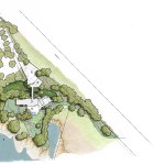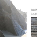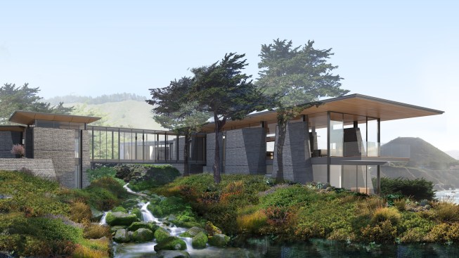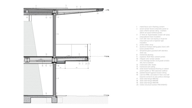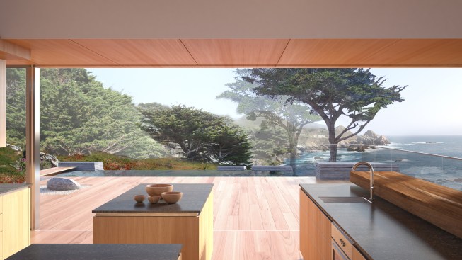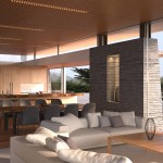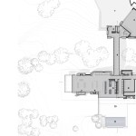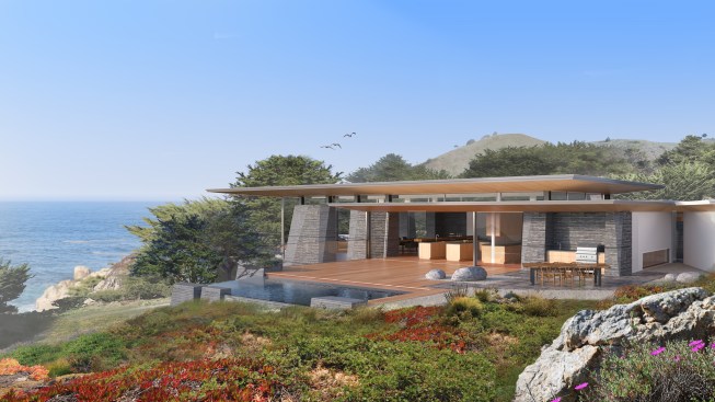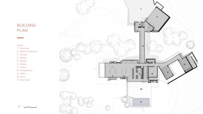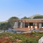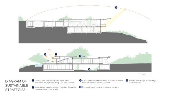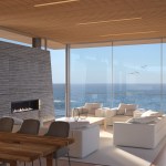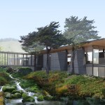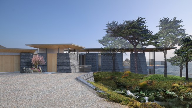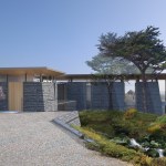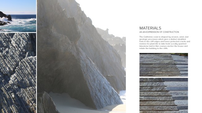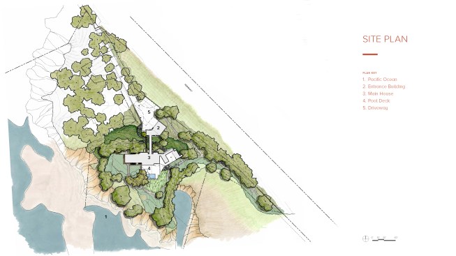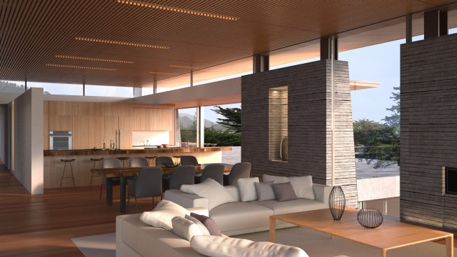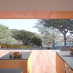 Seen from the hills above, the roof planes of the house appear to have been there for as long as the cliffs – the stacked walls of the building revealed as the ground falls gently into the Pacific. The design draws inspiration from these natural forces and places the architecture as a direct response to their formation – as though to express a continuity of the site’s evolution. The California coast is shaped by erosion, wind, and geologic processes which give a distinct stratified form to the cliff edges and leave protected cracks and ravines for plant life to take hold. The site is defined by a quiet canyon which wraps down the length of the site and spills into the Pacific Ocean below. In between is a beautiful South facing peninsula topped with a windswept grove of Cypress that form a protected cove along which the main house is sited. On the opposite side of the canyon is the Genkan, the arrival building which leads to the main house along a wood and glass bridge from which the full length of the Canyon can be taken in. The layout of the house follows the form of the natural topography, echoing the fractures of the cliff sides as it bends to take the form of the land. The resulting spaces form a series of protected garden courts that provide shelter from the intensity of the coast. Movement through the house is orchestrated as a series of framed views of the landscape which bring one closer to nature with every turn. The house uses two primary, elemental materials of wood and stone. Together these two materials become elevated to express the spirit of the architecture. This forms a dialogue of hard and soft, and cool and warm, and aims to form a compliment to the surrounding landscape and make it livable. Locally quarried limestone laid in thin courses anchor the house and relate the building to the cliffs. Wide-plank reclaimed Teak flooring creates a calm plane that connects the interior spaces of the house with the lookout deck and engawa, the deck extension which connects the upper walkway to the garden facing the canyon. Walls stop short of the roof plane which floats above, creating a continuous band of clerestory windows that allow the natural light to illuminate the house as it changes throughout the days and seasons.