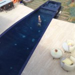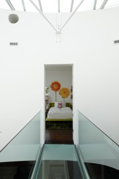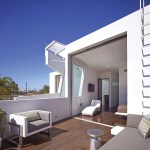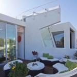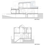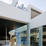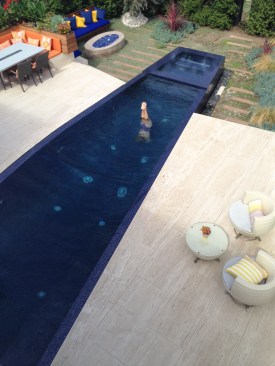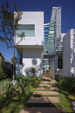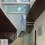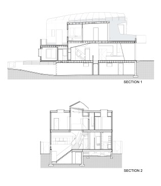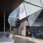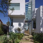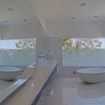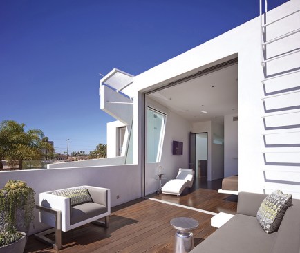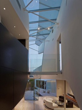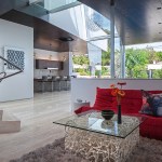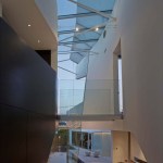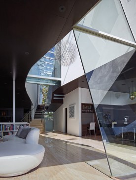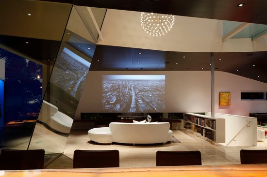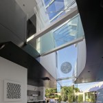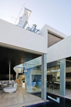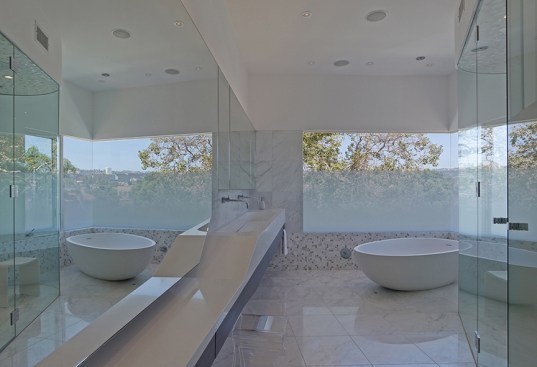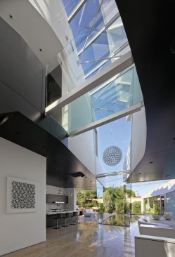 This distinctive residence rethinks its typical Los Angeles, post-war, tract-home neighborhood. A noteworthy street presence and a surprising sense of expanded interior space sets a new standard for a contemporary, semi-urban home. An unexpected double-story curvilinear void begins at the front entrance and runs the length of the residence to create transcending relationships among indoor and outdoor living areas. A 52-foot continuous skylight and sunshade extend along the curve of the void, while indirect natural light floods the center of the residence. The primary circulation of the home occurs along the curve, converging and diverging at threshold moments, creating sinuous pathways that are punctuated by city views, framed within the vertical slot of space, which becomes a viewing device for the new spatial connections. The owners communicated a clear sense of particular goals both desired and achieved. “We wanted to be active collaborators on the project and sought out firms that operated in a similar fashion. Our 28-page program included a list of functional rooms and spaces along with supporting photographs we’d clipped over the years. We wanted our home to have articulations, both linear and non-linear that offered dynamic interplay with light and sky, interior and exterior. We also wanted to have a strong visual connection to the outdoors.” The long narrow curving pool in back continues the interior geometry, extending out of the house from a seamless glass alcove, seemingly carved from the spatial void within. A sculptural stair is both grounded and floating, while a second-floor transparent glass bridge hovers in the void above, transmitting multiple lighting effects that enhance the lens-like qualities of the residence. An elegant palette of contrasting materials contributes to the expansive feeling of this home, creating a strong depth of space, while finely detailed tectonics contribute to the blended spatial interactions. At the entry, polished travertine emerges to create a sculptural stair base, which continues throughout the house to the rear terrace, further blurring the lines between indoor and out. Above, an ebony ceiling melds with the open ebony stairs, spanning down to the travertine to create the floating feeling. The residence provides an “open privacy” on the ground floor by visually connecting the entire site, while delineating a series of smaller spaces within the open ground floor. As ex-New Yorkers, the owners claim an ideal oasis within the city saying, “Our unique contemporary home is close to shops and restaurants yet surprisingly quiet and secluded enough to skinny dip.”