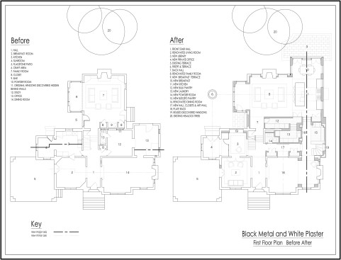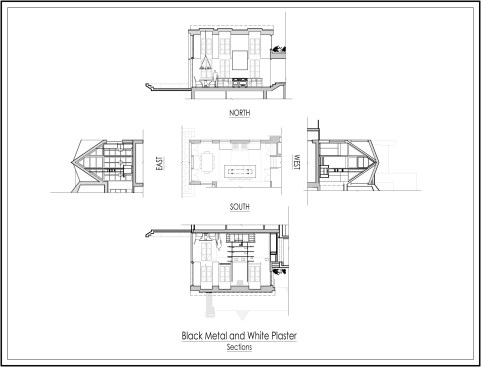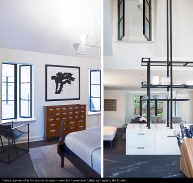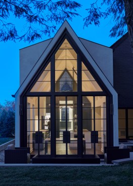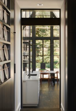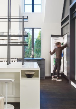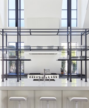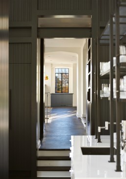 The challenge to respect the existing architecture while still delivering a modern design was achieved by taking cues from the existing Tudor. There, windows and door openings remained untrimmed and stark plaster walls contrast the original black metal windows. Like the existing, sharp, black elements contrast fields of white. With a ceiling pitch identical to the existing roof and chiseled dormers, a stark two-story untrimmed ceiling hover over the kitchen space referencing the existing homes plaster walls. Grid members in windows and on saw scored paneled walls and kitchen cabinetry mirror the machine age windows as do exposed steel beams and bolts. The exaggerated white field is pierced by an equally exaggerated 13 foot black steel tower that references the existing home's steel door and window members. Glass shelves in the tower further the existing window parallel. Even though it held enough dinner and glassware for eight, its thin members and transparent shelves defied its massive nature allowing light to flow through it, affording the kitchen unobstructed views and the feeling of continuous space. Finally, appreciation of nature was a design priority as the full glass at the end of the kitchen reveres a grouping of 50-year-old Hemlocks. At the opposite end of the kitchen, a window close to the peak looks up to a green roof.