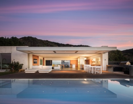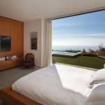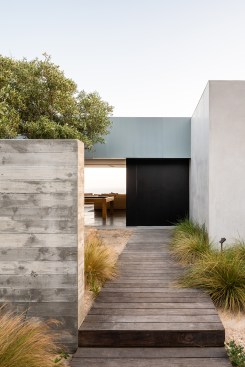 Situated on a sloping hillside with ocean views in a typical residential neighborhood, this project was an extensive renovation of an uninspired house that failed to take advantage of the obvious assets of the property: the views. Although no square footage was added, the interior spaces were completely reorganized, taking down interior walls and reorienting living spaces to open up to the incredible views of the Pacific Ocean. Living, dining, study and kitchen were combined into one common space that is framed by a wide opening that pockets away completely, revealing uninterrupted views of the ocean. The master bedroom was also redesigned as a single set of flowing spaces. Bedroom, bath and closet have no doors separating them and of course are open to the ocean view. The simple material palette of concrete floors, stucco exterior, Rhinezink panels and walnut cabinets was another strategy to keep the architecture focused on the site and place. The entry sequence was designed to create privacy from the street: a mature olive tree sits in the entry courtyard behind a board-formed concrete wall, providing glimpses of the Ocean beyond while entering the house. The owner is a single professional with grown children. She volunteers her services at a clinic operating out of Loyola Law School that works to seek justice for those that are wrongly incarcerated. The house is meant to create a sense of respite from her volunteer work. Now that she has moved in, the house is a constant center of activity, where she enjoys hosting her family and friends.