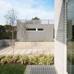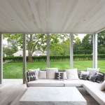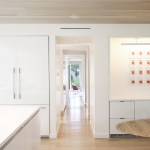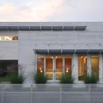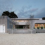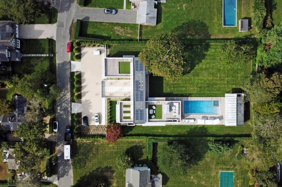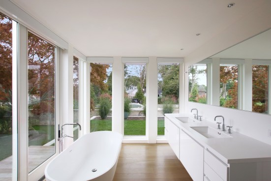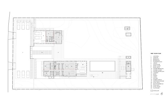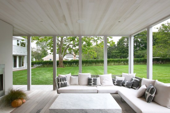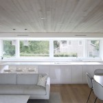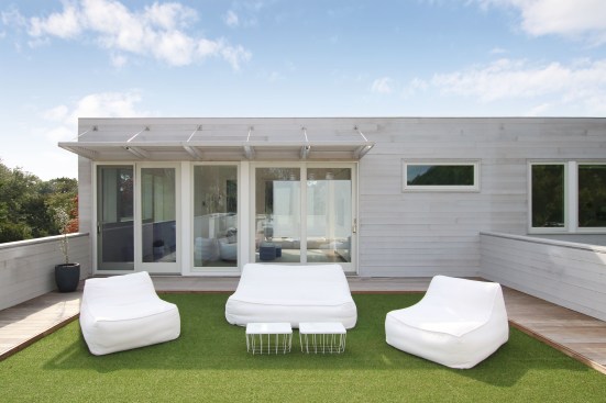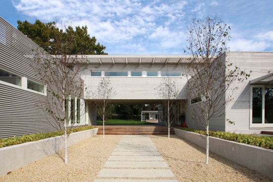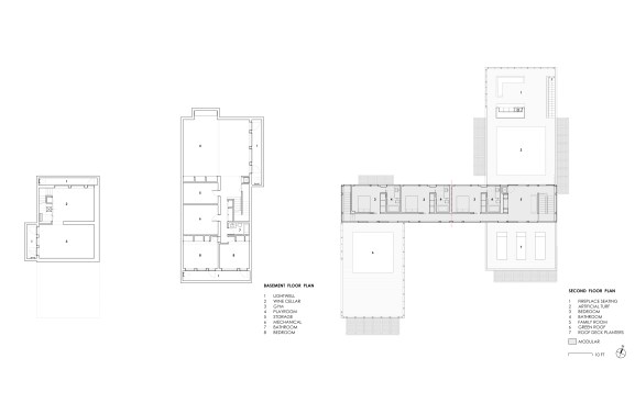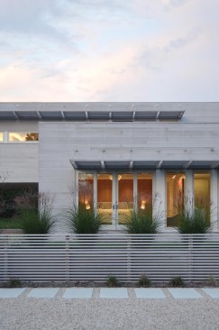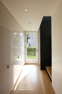This custom modular home was completed using a design methodology developed and refined over fifteen years of research and experimentation in prefabricated construction. Rather than try to reinvent modular production, this systematic approach leverages existing prefabrication methods by understanding and working within factory limits to efficiently design a home specific to the client and the site. Here, the client's brief called for a casual, light-filled summer retreat, centered on maintaining a fluid indoor-outdoor connection with exterior spaces for lounging, playing, and entertaining. While the house is much larger than the cottages that line the street, it was important to the clients to be a good neighbor. So, the main level, composed of four modules, is broken into two smaller volumes and clad in weathered gray cedar. Without a formal front door, a welcoming tree-lined auto court leads to an entry deck. This covered deck is created by a spanning second story, composed of two more modules, that defines the threshold between public and private. Pulling apart the house's volumes generates opportunities for permeability between inside and outside. With sliding doors abundant and 5800SF of continuous decks wrapping the house, it becomes just as natural to utilize outdoor connections between living spaces as indoor ones. Inside, the clients wanted a minimal, white interior that would be light and bright, but also hold up to their three young kids. White acrylic built-ins provide effortless storage to easily hide toys, shoes and beach gear. Cedar ceiling and white oak flooring adds warmth, balancing the white material palette. Leveraging the factory, about eighty-percent of the house was built off-site. The modules were set by a crane on a conventional basement in two days, leaving systems hookups, minimal interior finish work, and exterior work to be completed by a local contractor.