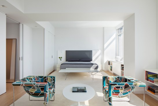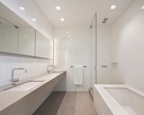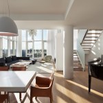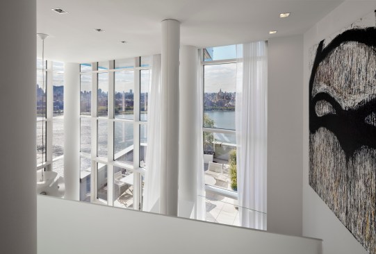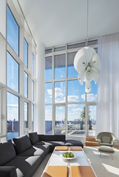 This project combines two separate units into a single duplex apartment overlooking New York’s East River. From a double-height living area and adjacent terrace one can view five Manhattan bridge crossings. The upper level master suite overlooks the atrium while sharing city views through a privacy window. At the lower level, there is a separate children’s bedroom and study zone. The focus of the apartment is a large open kitchen, dining and living room and terrace where the family spends time together. An expanse of open wall space hosts a contemporary painting collection. Audrey Matlock Architect was responsible for the architecture and selection of furnishings.