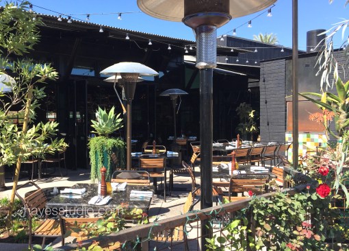Facing the patio northeast rewards outdoor diners with a gorgeous view of the Camelback Mountain; by flanking the patio with the fireplaces and server station, it created a sense of enclosure, guarding the guests from the urban noise and provided points of visual interest. The entrance features a floor- to- ceiling steel glazed entry which continues the experience of the outdoors as guests enter the interior of the restaurant. Restrooms are raw, simple spaces resembling boathouse washrooms. hayes inc. provided the exterior architecture of the building along with select interior elements such as the bar rack and banquettes; the owner was responsible for the interior design of the space including lighting, wallpaper, select furniture elements in addition, the owner also selected the final exterior paint.