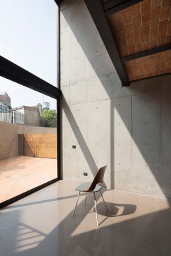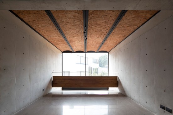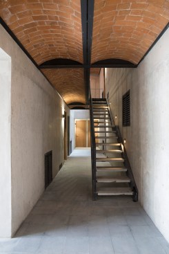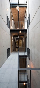 The project aims for a very clear integration between space and structure. All of the materials are used in order to emphasize their plastic qualities. The layout of the apartment units also creates a clear articulation of structural systems and materials. The double-height central circulation, which is designed to bring additional daylight into center the center of the building, is built with a metal structure and vaulted brick ceilings. Near the circulation are the service spaces, kitchens, bathrooms and washrooms, which are made of load-bearing concrete walls and a solid slab of concrete for installations. And finally, at the front and rear facades are double-height rooms which are built of concrete walls and vaulted brick ceilings.