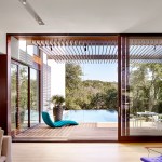 seem to go beyond the ceiling plane, oversized mahogany sliders, and a