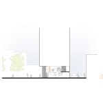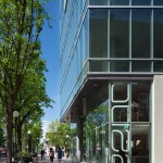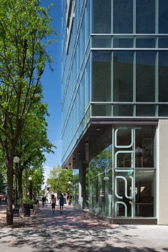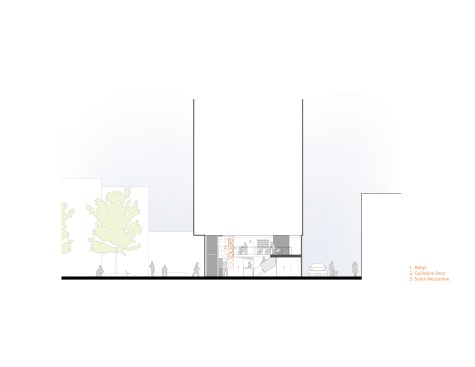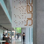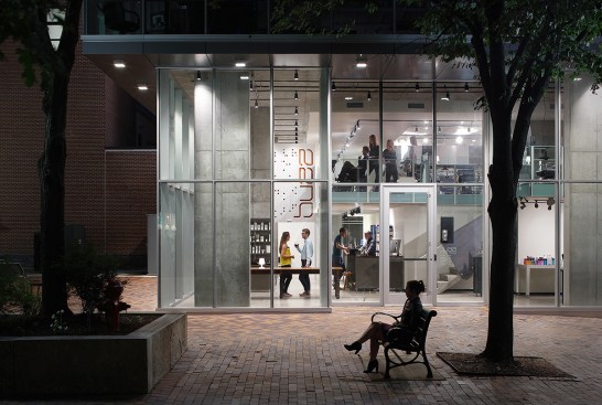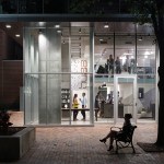 As the salon opens on the plaza, the gate rises, effectively redrawing the boundary of the downtown’s public space. At night, the lights of the styling stations cast a glow across the brick walking surface, creating a lantern-like environment for pedestrians to view the creative activity inside.