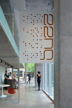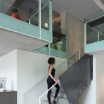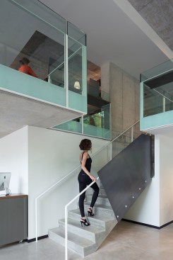 The space is located within a double-height volume at the base of a 14-story mixed-use high rise in the heart of downtown. The 1,700 square foot salon houses its retail component on street level, and elevates the styling functions to the mezzanine level above. A counterweighted, vertical gate—custom designed with the company’s logo—separates the building’s main lobby and the salon’s reception area. The vertical movement of the gate spans both levels of the business, creating a dynamic thread between retail and salon.