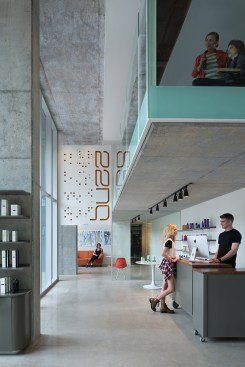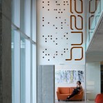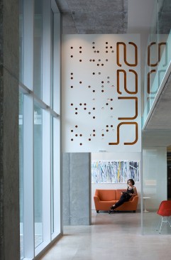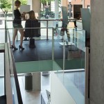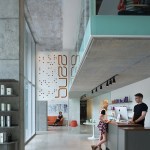 Playing off the store’s hybrid of industrial and modern furniture styles, the architecture marries the two genres by merging contemporary glass detailing and small interventions of hot-rolled sheet steel. Warm tones of steel and the “Buzz orange” seamlessly contrast the cool-toned glass, concrete, and white walls.