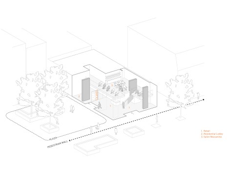 Set on the eclectic plaza of a Midwestern college town, this salon feeds off the see-and-be seen people watching culture of the city’s pedestrian mall. The project examines transparency, exploring the relationship between the city’s street level activity and the salon functions inside. The salon, a split use of retail and styling, creates an urban stage for pedestrians and customers alike to enjoy the artistic, club-like atmosphere the salon prides itself on.