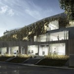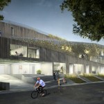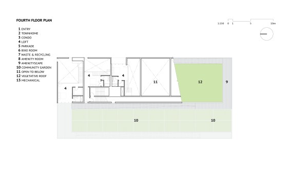 Celebrating the fact that the building challenges the typical four-storey box by incorporating three ‘topographical bars’, the building’s material palette accentuates this condition by alternating between weathered cedar siding and vertical aluminum grating. Various varietals of climbing foliage will eventually cover this vertical screen, providing both privacy for some units, as well as points of interest along the social-scape.