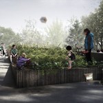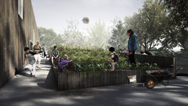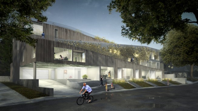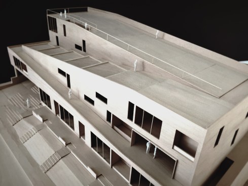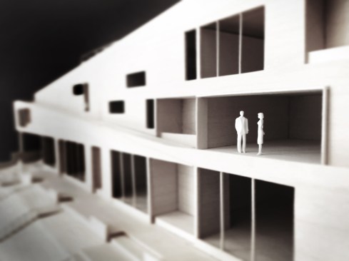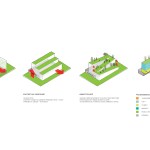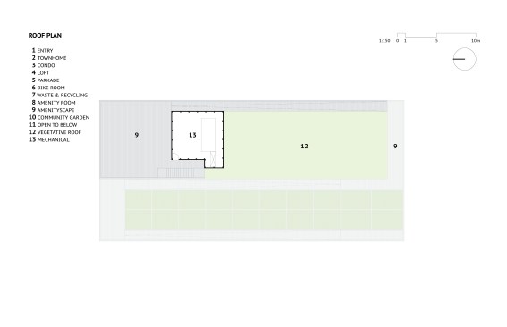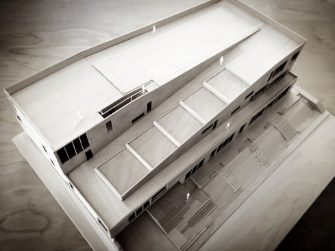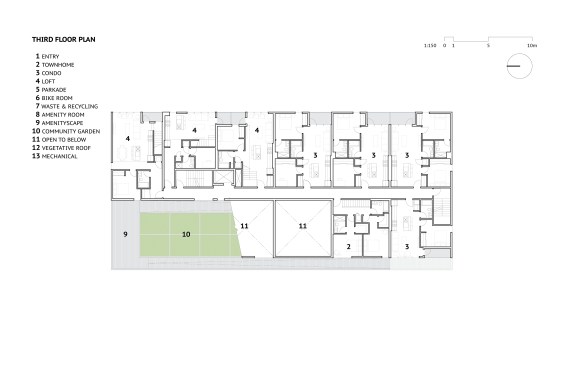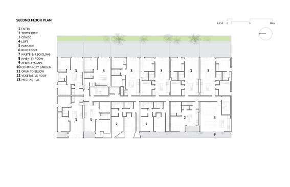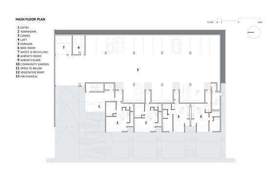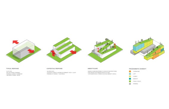 We began developing massing models that took advantage of the site’s steep slope by placing the parkade at grade, which pushes the rear units of the building up resulting in a terracing effect that helps to democratize light and view for most of the units. We shifted the density between the north and south property lines to accommodate differing height restrictions, creating essentially three ‘bar buildings’ that could be programed with different housing types. Offsetting and sloping these three bars provides for a generous exterior amenityscape. The requisite landscape requirements and amenity spaces intertwine into a vibrant social-scape that encourages spontaneous interactions and fosters opportunities for communal gardening, walking the dog, or just getting a breath of fresh air. This amenityscape, while satisfying the stringent landscape and amenity space requirements, introduces urban horticulture in the form of private gardens, vegetative roofs, apiaries, etc. at a scale previously unknown to inner-city living in Calgary.