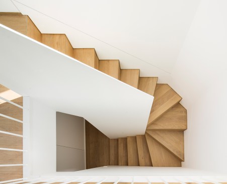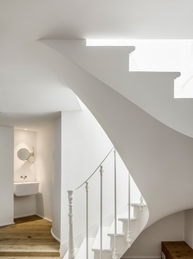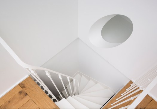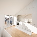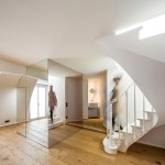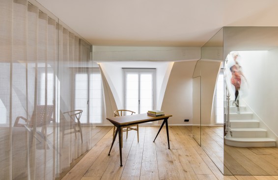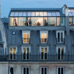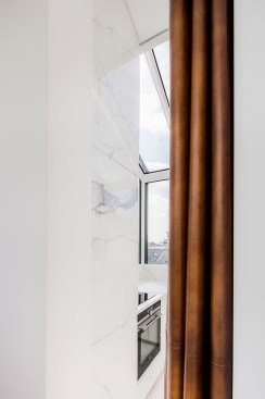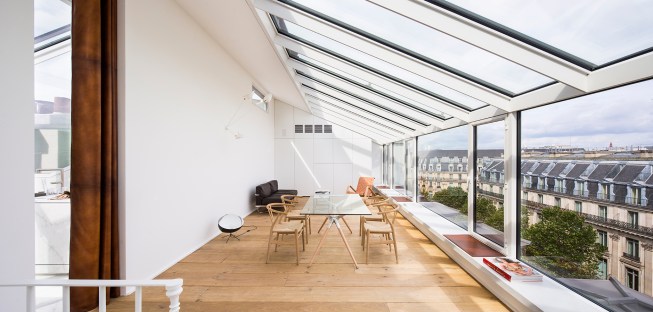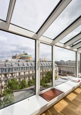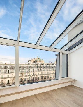 The repurposing of a space in the historic center of Paris into two apartments gave architect Vincent Parreira’s office an opportunity to work on a small scale in an exceptional context. Despite determinist formal and constructive features, this remarkably adaptable Haussmannian building has withstood repeated repurposing, though at the cost, it is true, of sometimes heavy interventions. The central framework of Haussmann’s Paris, the Opéra-Madeleine district has been transformed without changing its appearance: thus, number 17 Boulevard des Capucines is occupied with a vast program of the most up-to-date offices. Three addresses further down the boulevard, Vincent Parreira’s office just converted a 19th-century photography studio into apartments. If these premises have a far more modest surface area than the giant neighboring office building, the intervention is nevertheless significant. The clients, two siblings, own these two contiguous apartments, which share the same architecture and program, i.e., short-term rental properties. Access to these two prestigious apartments is via the former service staircase and the corridor leading to rooms formerly allocated to domestic personnel – yet another sign of the total transformation of uses and distributing architectural hierarchies so dear to the Second Empire bourgeoisie. Each apartment is a duplex, whose bedrooms and bathrooms are located on the lower level, while the reception area with its drawing room and kitchen are situated on the upper level, under the glass roof of what used to be a photographer’s studio. The upper level enjoys double exposure in both apartments. The views from these two vantage points reveal two quite different faces of the Parisian panorama. On the drawing room side, the view includes the gold and prestige of the Opéra Garnier, and the layout of the façades of the Grand Hôtel. From the kitchen side, the view opens to the chaotic landscape of Paris behind the scenes, its rooftops cluttered with all the required service elements – air conditioning systems, fire escapes, smoke dampers, etc. – of this functioning urban décor.