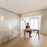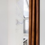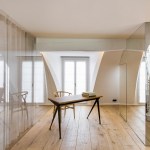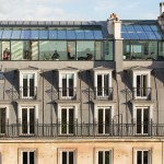 The architect’s lifestyle proposals are most fully realized in the apartments, which, intended for a single occupant or a couple, are unencumbered by issues of privacy or access to services raised by the presence of several autonomous and independent occupants. Thus, Parreira was able to take liberties in the partitioning of the spaces through his use of transparent glass and one-way mirrors. Glazing offered the possibility of partitioning a small area, or enlarging the space by hiding the disorder of a bathroom. “The bedroom is placed behind a transparent glass wall. Privacy is achieved not by means of a wall but rather with a curtain, through which shadows can be perceived. As for the large mirrored section, a distant wink at wink from afar to the Galerie des Glaces in Versailles, he generates an ambiguous situation. Is it a glass wall, or a closet? The idea it might conceal a shower never even crosses one’s mind. There is of course a bit of a theatrical game of appearance/disappearance, and the will to always be able to engage with the entire space.” The existing staircase was preserved and treated as a quirky object whose material and structural presence is somewhat out of place. It provides a link with an upper floor as open as the lower floor is private. In the drawing room, the occupant is seemingly in a display case, thrust into the urban space, and could also create the feeling of being the focus of a show, or of playing a part in one of these action crime movies which often end on the ocean of zinc and slate of Parisian rooftops, as seen in Frantic, Fantomas and Peur sur la ville… The deliberate decision not to install a curtain or shutters, justified by the particularity of building opposite: the façade of a grand luxury hotel whose clientele is merely passing through and rarely in their rooms. The built-in elements of furniture – storage cabinets and built-in banquette running along glazed façade which can serve as seating or a shelf – leave the space free of superfluous elements, which highlight the exceptional elements: leather curtain separating the kitchen and the drawing room, or inserts, also in leather, forming seating in front of the parts that can be opened in the glass façade, and the context overall. “Sitting on the bench, you are completely carried away by the sky” Parreira concludes, describing his project, a distant descendent of the Bisteigui apartment, which Le Corbusier endowed with a room that had the sky as its ceiling.