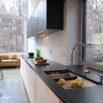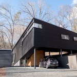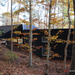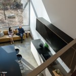 The homeowners honored their challenging property by letting it suggest the house’s modern, minimal form. Composed of clean, clear lines and a refined material palette (black corrugated metal, glass, and polished concrete block), the architectural profile reflects the natural topography as it rises and twists its way up from the lowest creek-side level to the height of the hill. In the process, the form also reflects the spatial journey inside.