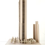 The design of the tower is founded upon principles of geometric clarity and openness that are reflected in its horizontal and vertical organization. The building consists of two complimentary volumes, a transparent south volume and a solid north volume. The relationship between these two main elements is emphasized through a subtle shift in both plan and elevation that creates a dynamism and variation in scale that responds to the immediate urban environment. Fundamentally, the solid north volume contains the services and core of the residential units that flow towards the transparent south volume which is a natural light-filled space where living, social and the more public programs are located. A carefully crafted geometric organization allows viewing corridors towards the mountains in the far distance.
