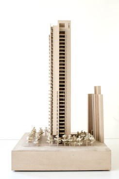 The design of the tower is founded upon principles of geometric clarity and openness that are reflected in its horizontal and vertical organization. The building consists of two complementary volumes, a transparent south volume and a solid north volume. The relationship between these two main elements is emphasized through a subtle shift in both plan and elevation that creates a dynamism and variation in scale that responds to the immediate urban environment. Fundamentally, the solid north volume contains the services and core of the residential units that flow towards the transparent south volume which is a natural light-filled space where living, social and the more public programs are located. A carefully crafted geometric organization allows viewing corridors towards the mountains in the far distance.