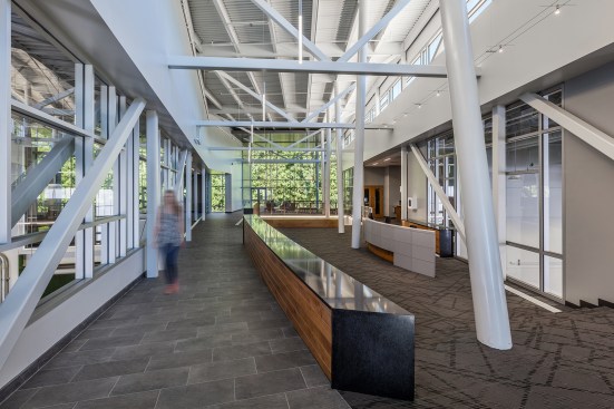 This new leading-edge center for advanced manufacturing technologies supports education, research, and entrepreneurship while training a highly skilled workforce. The 106,000 SF facility is the first building on a new International Style satellite campus, and is designed to both establish a distinctive architectural character and serve as a visual icon of modern manufacturing. The facility was designed to minimize disruption to the sloping site adjacent Long Creek, and the elevated pedestrian entrance bridge serves as an analogy to the Owner’s mandate to bridge education and job placement