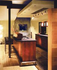 The judges particularly praised the architect’s “sensitive and artistic use of materials.” Dark-stained cherry cabinetry is topped with a matte black Richlite countertop (a composite material made of paper fiber). The warmth of the cabinetry contrasts with stainless steel appliances, a custom stainless surround that trims out the built-in refrigerator, and a steel sliding door to a small pantry that borrows a bit of space from the entry foyer. The room gains texture from recycled-glass tiles and a sculptural stucco wall. The wall’s deep window augments natural light that filters in from a clerestory. The dropped ceiling over the kitchen reinforces its boundaries and contains recessed and pendant lights that make certain this jewel-like kitchen is always in the spotlight.