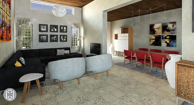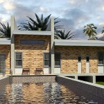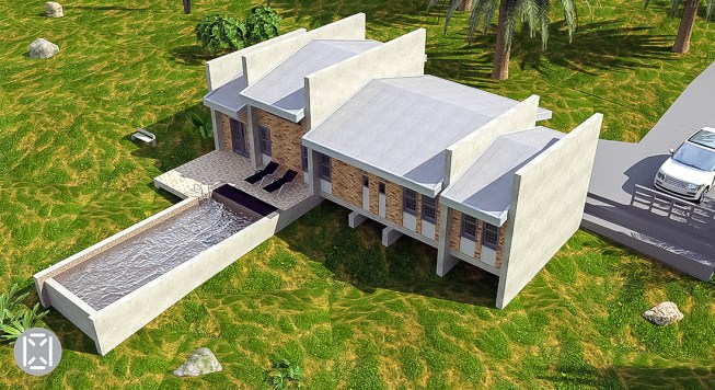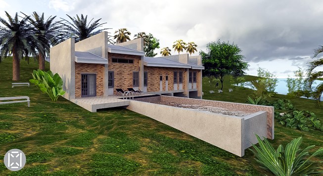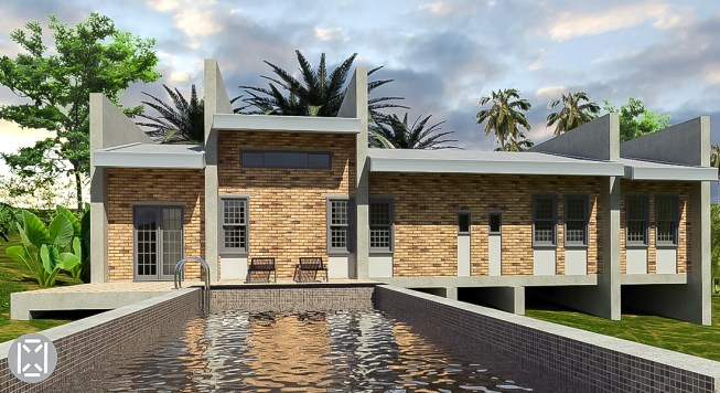 The 2 bedroom chalet hosts an elongated floating pool overlooking the Kwilu river below. Built on a concrete structure which walls are left exposed for low maintenance in this rough environment, the project uses locally manufactured burned bricks from clay found on the farm.