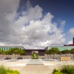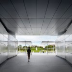 Visitors approach through a grove of Crepe Myrtle trees toward the chiseled granite wall of the Pavilion and a measured opening marked by a low roof overhang and lantern-like volumes on either side. One passes through a gateway of angled shimmering stainless steel walls under a metal ceiling that tilts up towards the Gardens and mount.