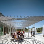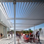 The entrance is flanked by a zinc clad meeting room to the north and a small contemplative garden to the south, spaces which provide indoor and outdoor amenities for Houstonians to enjoy and reinforce the connection to the landscape with broad views of the garden. A light metal trellis serves as a front porch for the Pavilion and mitigates direct sun exposure while allowing the Pavilion’s garden side to remain open and transparent.
