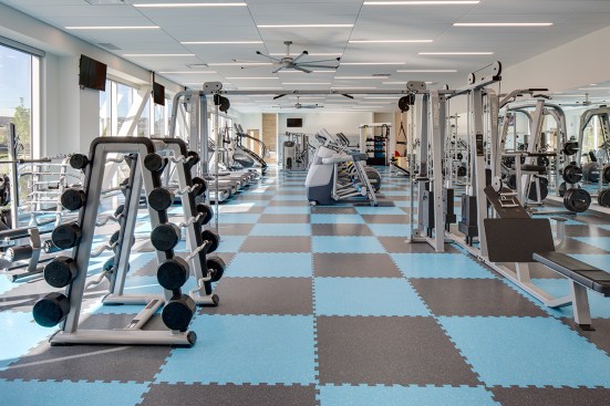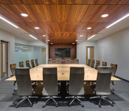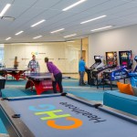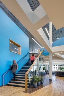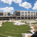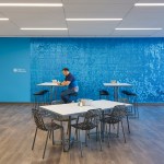 Employee-focused amenities include the heart of the campus, the “People Hub”, a central gathering space where coworkers can interact, meet clients, play games, or relax. Workers have access to a full-service kitchen and dining hall focused on fresh and healthy food. An on-campus wellness center is available for employees and family members, and a fitness gym and yoga center include locker rooms and individual showers. Connecting the two buildings at the second level is a bridge that overlooks the People Hub, enhancing the experience of a collaborative work environment.