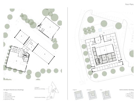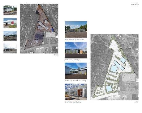 This project houses all Water and Wastewater Management administration, crews, technicians, vehicle fleet, and emergency equipment and materials for a capitol city. Previously, for decades, all staff and crew occupied a former, windowless “big box” chain store, in a circuitous, disorganized array of thrown together offices and random spaces. At the start of the project, therefore, optimal adjacencies and distribution of personnel and resources were quite unclear to both client and architect. Through a rigorous programming effort, project requirements became simplified, and a streamlined picture emerged for how to efficiently utilize the separate existing structures and organize the new site.