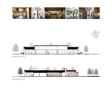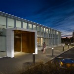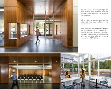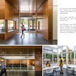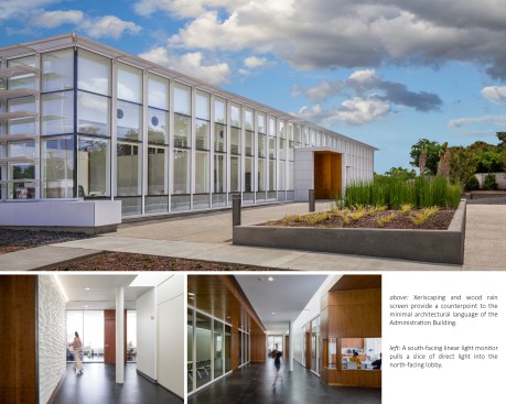 Echoing its original function, the showroom location is repurposed as the only facility accessible to the public, as the Administration building with a conference room that doubles as a community room. In its new iteration, the Administration building is conceived as a simple glass prism, utilizing ceramic frit and perforated aluminum sunscreens at the exterior curtain wall to modulate light. Offices wrap the exterior, with a modular glazed partition system admitting daylight fully through the building. At the north-facing lobby, a south-facing linear light monitor penetrates a vegetated roof to pull direct sunlight into the space. Lighting on sensors throughout the building is designed to respond efficiently to changes in light levels, for daylight harvesting. An exterior composite wood rain screen lines the inside face of each of the three entries, providing a warm contrast to the otherwise restrained glass and steel exterior, introducing at the exterior a primary feature of the interior wood palette integrated into the partition system.