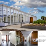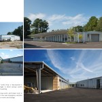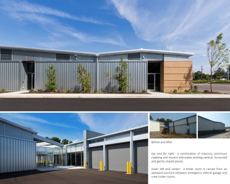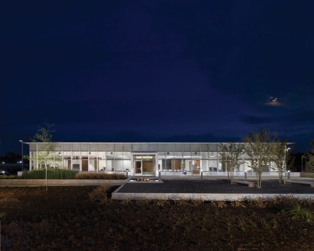 This project converts an abandoned automobile dealership to offices and warehouses for a municipal water division. Rigorously simplifying diverse program components allowed for logical reuse of existing structures. The office building, a sustainably-designed glass prism under a vegetated roof, exaggerates the extraverted spirit of the original showroom, bathing occupants in daylight. New materials and details on the pre-engineered warehouses visually separate planes, expressing low-sloped roofs as floating undulations, referencing the sloping site. Site improvements include re-milling and reuse of existing asphalt, xeriscaping and rain gardens. This LEED Gold project is the City of Columbia’s first sustainable facility.