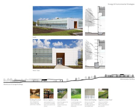 Prior to construction, the site, which slopes north to the adjacent neighborhood, was covered entirely in asphalt and was 100% impervious, creating erosion and flooding. In addition to rehabilitating this former Brownfield site, the site design included milling and reusing the existing asphalt, while also reducing total site imperviousness by more than 30%. Eighty-three percent of construction waste was recycled, and water use was reduced by 40% through a combination of xeriscaping and efficient fixtures. In addition to the extrinsic vegetated roof on the Administration building, the site includes six rain gardens and pervious hardscape. A variety of native trees have been placed throughout the site to provide a nearly continuous canopy of shade as they mature.
