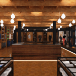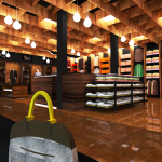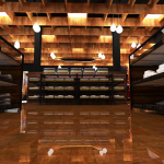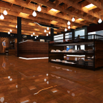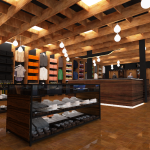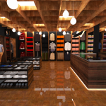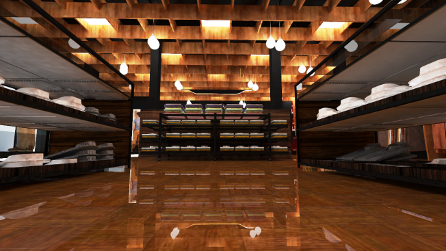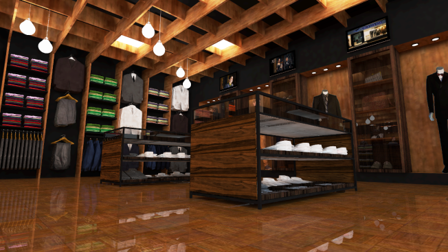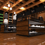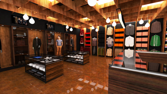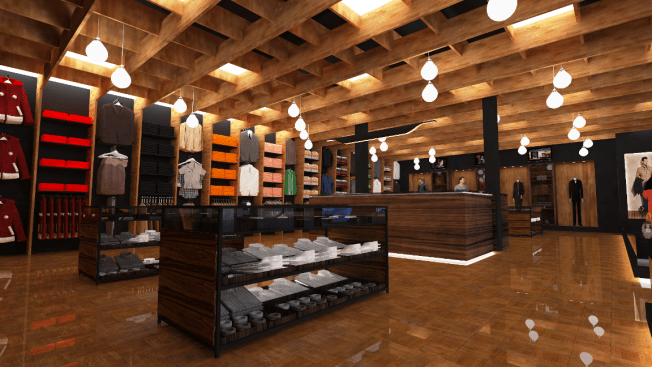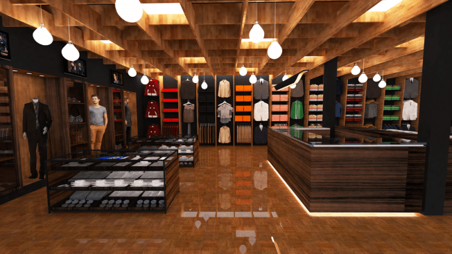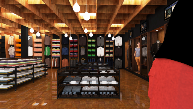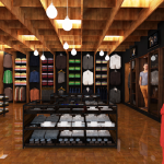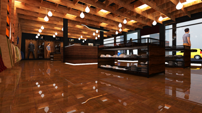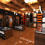 The wooden grid created in the ceiling is transformed into a display area of clothes by being continued on the wall.The wooden structure on the ceiling also defines a grill in which the lighting elements are placed.