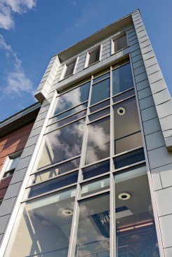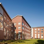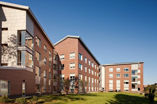 This four-story residence hall features a two-story lobby/lounge area adjacent to a community room, which will accommodate students and can also serve as a venue to host campus-wide activities or events. Immediately outside the community room, located on the south-facing side of the building, is a level open lawn, while the rear of the building features a more active area with an outdoor volleyball court overlooking a wooded site.