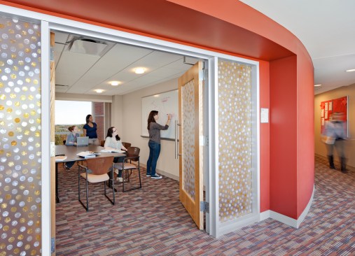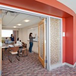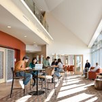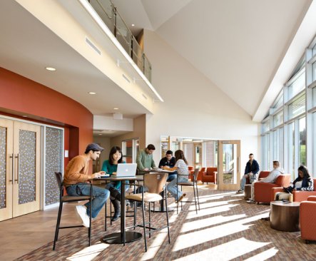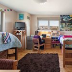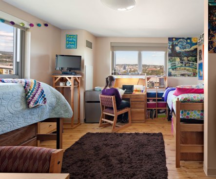 Figge Hall is comprised of 156-beds in four-bed suites, each consisting of two doubles adjoined by a shared living area, dining area, kitchen, and a compartmentalized bathroom. Community spaces programmed for use by the entire College community are placed on the first floor to allow for access while ensuring security for the residential floors.