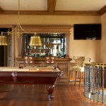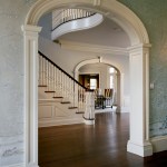 Principal rooms retain a classic style that corresponds with the front elevation. The continuous curved wood handrail at the entry staircase delivers an understated elegance to the entry. The dining and living rooms are set in a formal arrangement, each with a fireplace centered on the elliptical arches from the entry hall. An English pub inspired billiards room and adjoining paneled library feature a custom iron and brass spiral staircase to the wine cellar beneath. Featuring classic yet restrained detailing, the house encourages an assortment of formal and casual living.