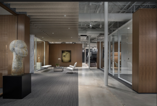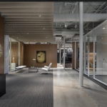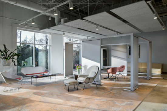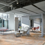 Our design process began with a deep dive into the legacies that precede Corporate Environments. We explored the history of Florence and Hans Knoll and their contemporaries–the modern masters they worked closely with, including Mies van der Rohe, to produce the iconic workplace furniture loved for decades and still produced by Knoll’s exacting standards today. We studied the details of the existing 1960s warehouse building and it’s consistent, though subtle, references to Mies van der Rohe. We developed an appreciation for the modernist dream of pre-fab mass customization present in DIRTT. What we found through our design research was that Mies formed a common thread in all three legacies, thus providing a lens through which we could conceptualize the whole project. We set out to pull all the myriad complexities of the design problem into a simple Miesian composition, logical and architectural while rich in material expression.