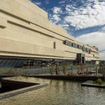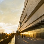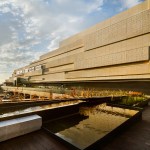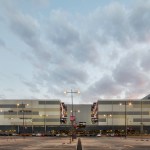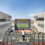From outside, the shopping mall is presented as a large rectangular container, with an emphasis on the principal façade, which with its 400-meter length and horizontal strips with different textures and a uniform color, reinforces the horizontal nature of the mall. The concept is based on two well-defined areas with pure shapes (a circle, a triangle), between which horizontal displacements give movement to the space while letting natural light into the atriums, which contain artworks by Sebastian and Tere Metta. The central space generates external terraces at ground floor level, generating a forum with a vast LED screen as a backdrop.
