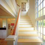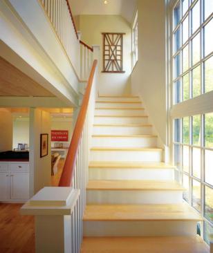 Here, however, stripping down is more than a mere process of subtraction. At the first floor, service and circulation spaces line up neatly along the inland-facing wall, while the major rooms—kitchen, dining, and living rooms, a guest bedroom—open onto covered porches and a meadow-like yard that stretches down to the shore. The architects ordered the first-floor plan around an exposed structural-steel frame that serves as a link between the Shingle-era utility buildings that inspired the house and the Modernist buildings that followed them (see “Framed Art” sidebar). “The rigor of the plan sort of came from the steel frame,” Elliott says. The profile of the I-beams and the frame’s bolted connections also add a bit of visual interest at the wall/ceiling juncture. Onto that structural—and thematic—framework, the house hangs elements drawn from both Shingle and Modernist vocabularies, which blend in a surprisingly natural way. The pickled fir beaded-board ceilings are a classic cottage touch, as are the kitchen’s slate countertops and nickel cabinet hardware. The bright-finished mahogany stair rails, vanities, and accents are an unmistakable reference to the wooden sailing yachts native to these waters. Eight-over-two double-hung windows also bow to tradition. But the openness and strict rationality of the plan are straight out of the Modernist playbook, as are the tasty, low-fat trim details. Windows and doors get by without casing. Porch columns are black-painted steel pipe; roof brackets at the second-floor porch, painted steel plate.