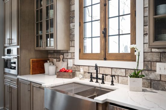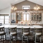 The kitchen is truly the heart of this home, anchored by the large island that houses the six burner cooktop. Custom Schrock antiqued cabinetry and Calcutta quartz countertops are used throughout. The stone tile used on the front of the island and backsplash complete the look.