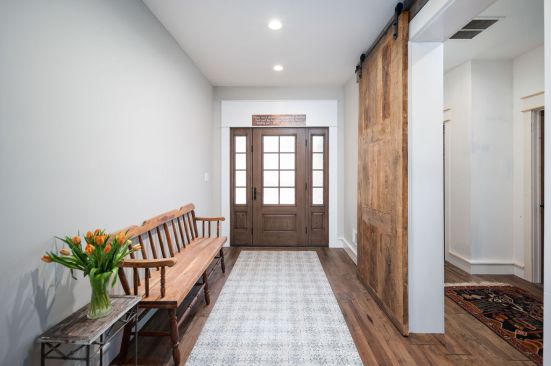 Two bedrooms and a full bath are accessed through an oversized barn door off the foyer. The powder room features a floating concrete vanity and vessel bowl sink.