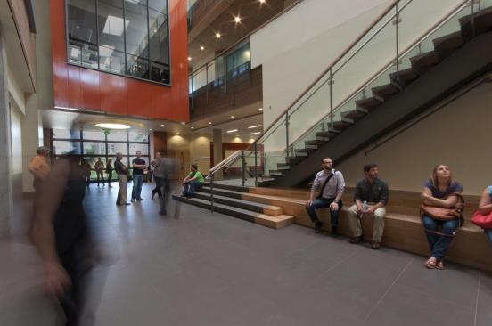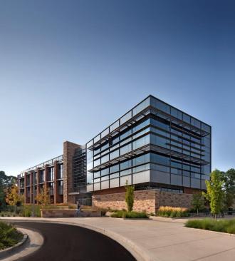 LEED Gold certified, the building’s tight envelope, position on site and naturally ventilated three-story atrium takes advantage of the Colorado air as it flows west to east. A highly efficient curtain wall system, along with interior and exterior sunshades on the building’s south facade, allows for ample daylighting, and all labs and offices have light sensors to decrease electrical usage. Finally, a rooftop data center helps preheat air before it enters the building, further reducing energy costs.
