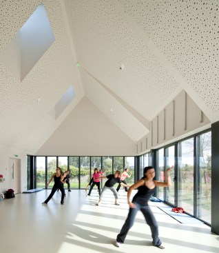 Is located at the end of the left wing, in its corner. It settles into the main building with delicacy and elegance. The same architectural language as the main building or the signal building is preserved, that is to say, a deep purple slate covering and cladding, metal grid shutters and wide windows, referencing the building’s wide prows. These openings in the facade and roof ensures the dance rooms remain well-lit while protecting them from outside eyes.