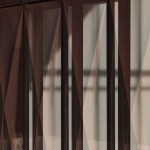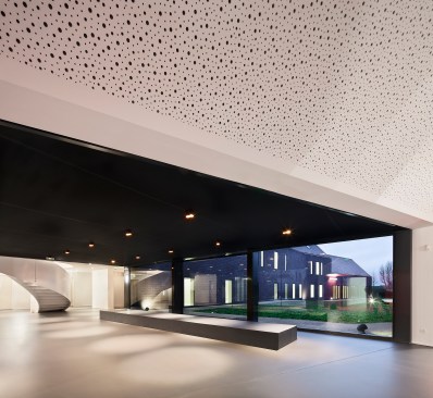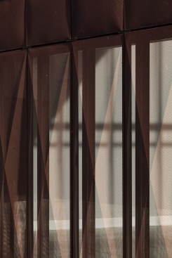 The extensive glass facades are covered, in places, by a copper grid to dress the large volumes and transparent bays, creating intimacy or protection from the sun. This grid appears intermittently on the ground floor and extends over the entire height of the South truss to shield the large meeting room from outside eyes. Furthermore, it enters into conversation with the sign-building at the entrance. The diamond shaped corners of the copper boxes lend them a hard edge which brings them to life. The external gates are made from solid copper.