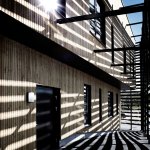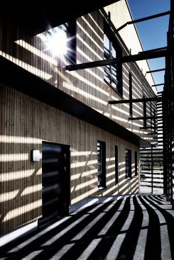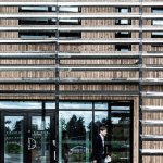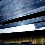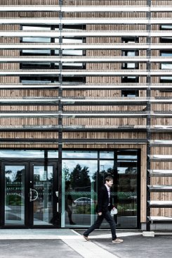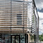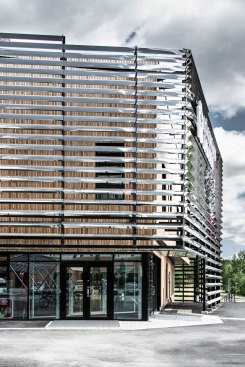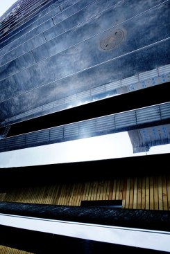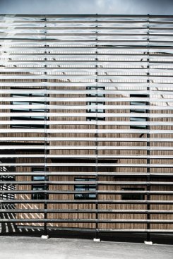 The characteristic double facade with reflecting horizontal lamellae fronting a wood cladding was developed in collaboration with Danish artist Jeppe Hein. Instead of creating an isolated piece of art work Jeppe Hein and ADEPT has developed the competition design for the facade into a detailed and refined expression with an immateriality that mirrors its surroundings and the people in it with broken reflections. The lamellae are made from highly polished stainless steel while their wooden background is a Siberian larch.