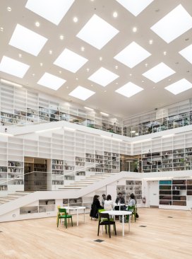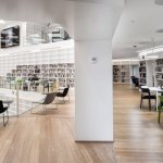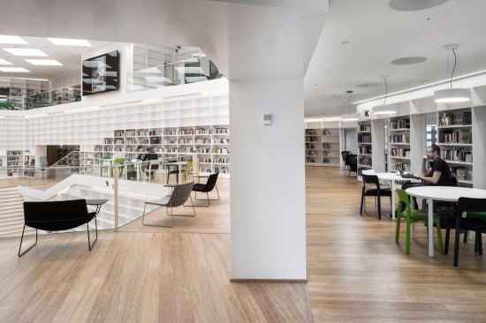 The spiral of knowledge creates a varied study environment allowing the students to move about in the heart space of the library or to withdraw to more quiet areas along the facade. The variation of sound levels and the differentiation of activities creates a versatile library that is rich in experiences. The building has its very own spatial character uniting library and multi-media functions to create synergy with the existing university complex.