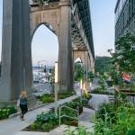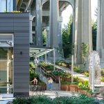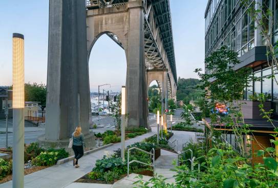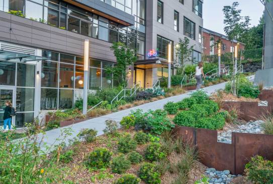 Ambitious landscaping with a series of bioswales along the east edge of the site will retain and treat rainwater runoff from Troll Avenue and the Aurora Bridge. This on-site treatment will clean water prior to discharge in Lake Union, or allow it to be reused on site if applicable.